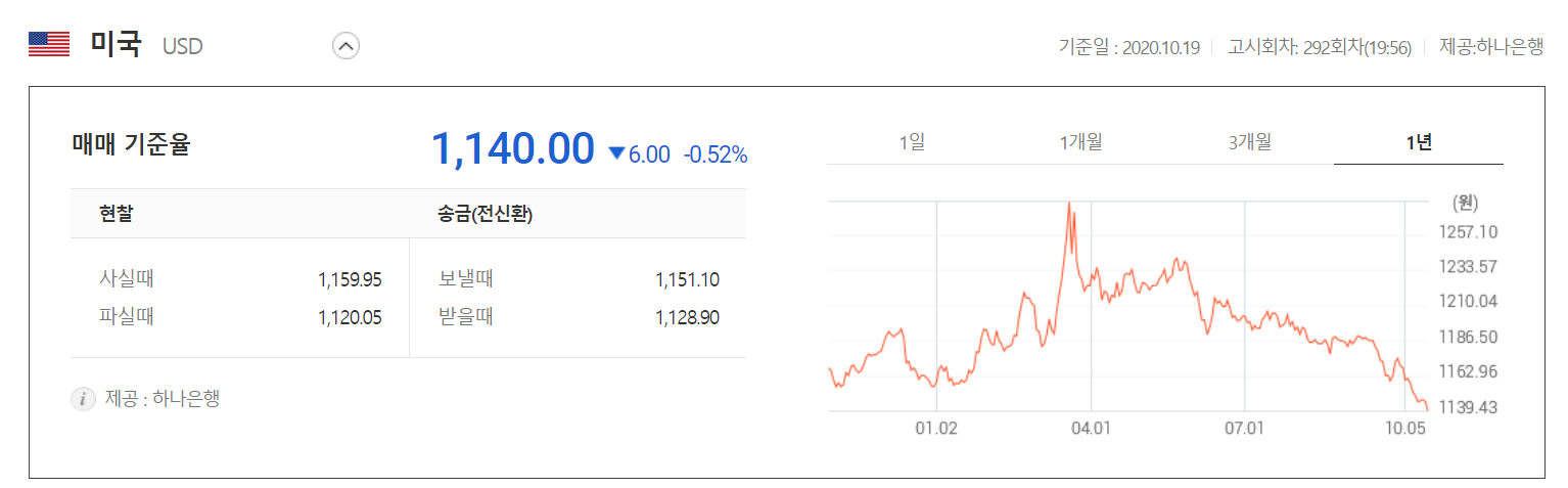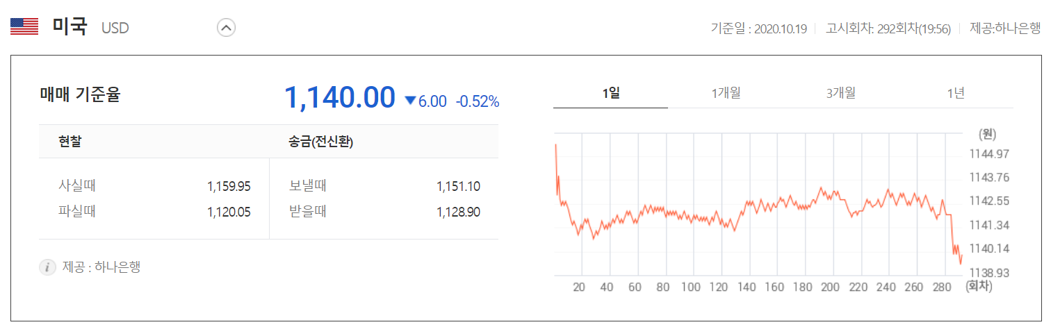 환전 고시 환율 2020.10.19 19:56 하나은행 기준 고시회차 292회