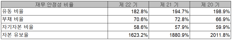 2020년도 당기말 기준 재무 안정성 비율에서는 유동비율 182.8%, 부채비율 70.6%, 자기 자본비율 58.6%, 자본 유보율 1,623.2%를 기록하였습니다. 지난 2021년 1분기부터 흑자 전환하는 등 실적이 개선되고 있으며, 당기 말 기준 재무상태도 양호한 수준입니다.