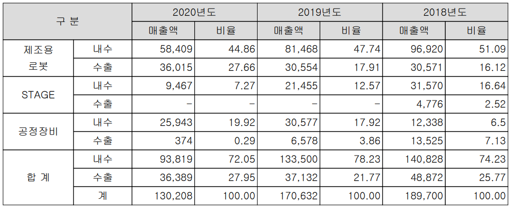 2020년도 당기 말 기준 당사의 주요 부분별 매출에서는 제조용 로봇의 매출이 944억 원으로 전체 매출의 72.5%를 차지하였으며, STAGE는 95억 원으로 7.3%, 공정장비는 263억 원으로 20.2%의 매출 비중을 기록했습니다. 당사의 전체 매출에서 내수와 수출의 비중은 각각 72%, 28%를 나타냈습니다.