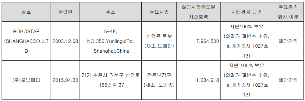 또한 종속회사인 로보스타 중국(상해) 법인에서는 제조용 로봇 사업을 주력으로 영위하고 있으며, 2015년에는 전동보장구 사업을 영위하는 (주)로보메디를 종속회사로 편입하였습니다.