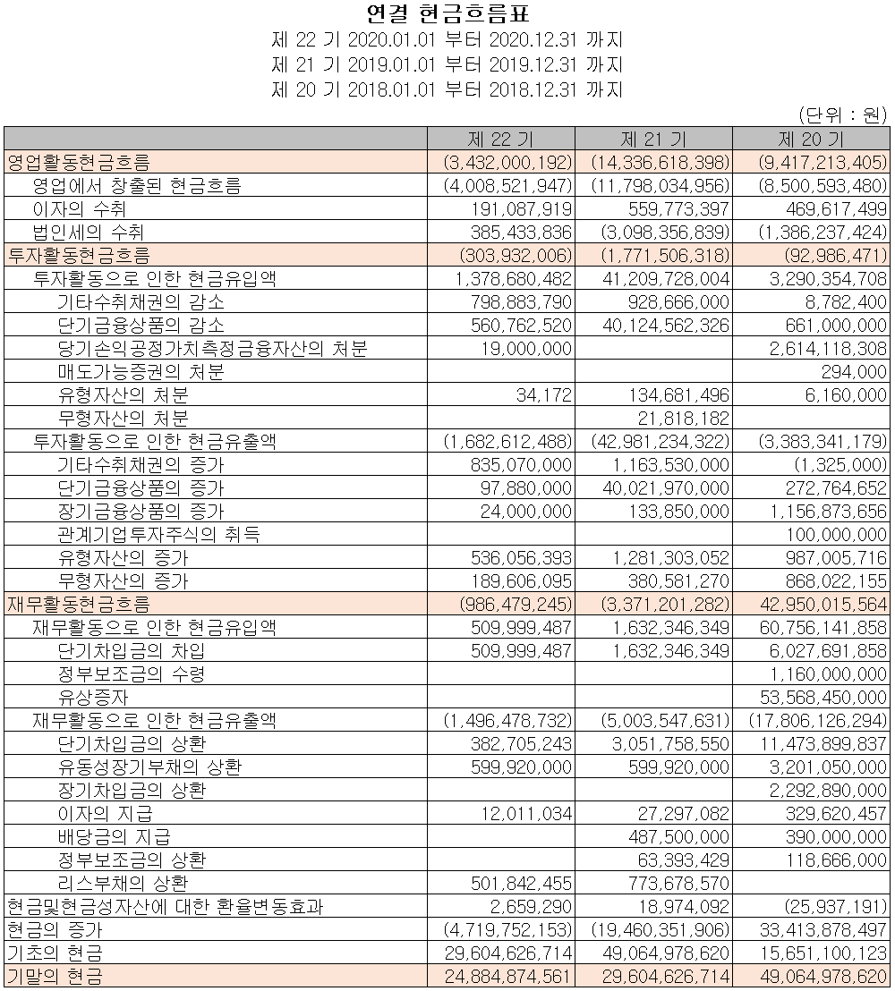 당사의 지난 2020년 영업활동 현금흐름에서는 실적 부진에 따라 총 34억 원의 현금이 유출되었으며, 차입금을 조달하여 부채를 상환하였습니다. 2020년 당기 말 기준 현금 및 현금성 자산은 전년보다 47억 원 감소한 249억 원을 보유하고 있습니다.