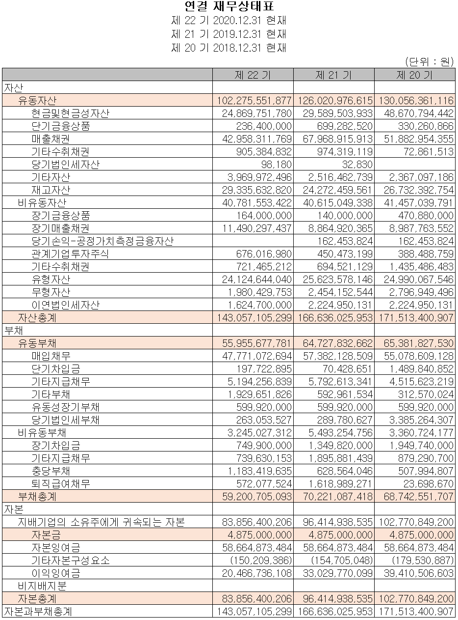 2020년 당기말 기준 자산 총계는 전기보다 14.1%(236억 원) 감소한 1,431억 원으로 매출채권 및 유형자산의 감소에 기인합니다. 부채는 15.7%(110억 원) 감소한 592억 원으로 매입채무, 기타지급채무 등의 감소가 있었습니다.