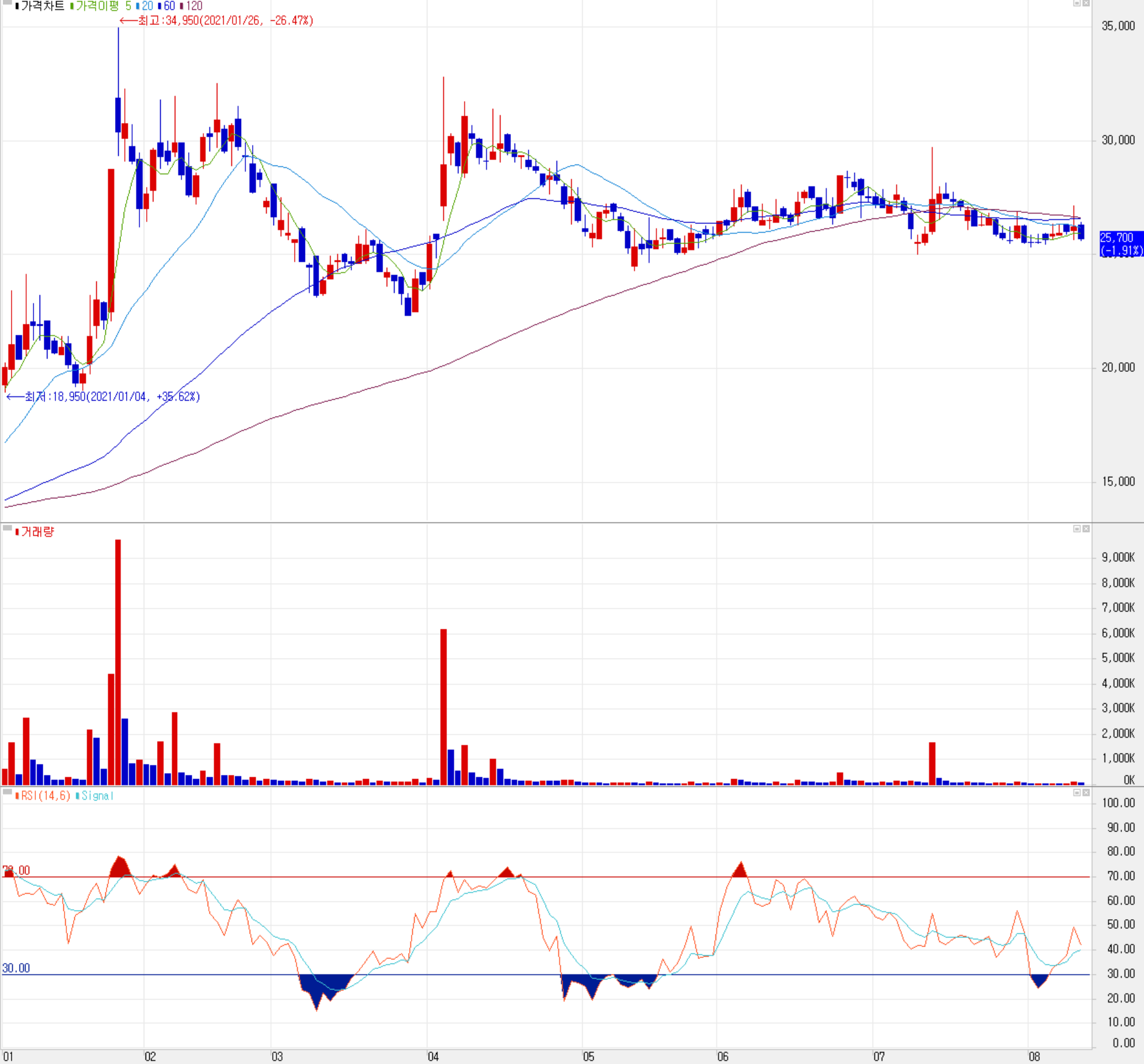 8월 11일 장 종료 기준 당사의 주가는 전 거래일보다 1.91% 내린 25,700원에 거래를 마쳤습니다. 외국인 비중은 1.94%이며 시가 총액 2,506억 원으로 코스닥 시총 상위 429위 종목입니다.