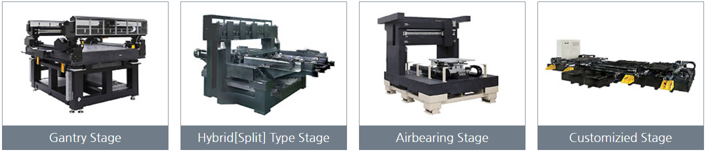 디스플레이 시장 및 그 외 각종 초정밀 가공 기 및 검사외 다양한 공정장비의 기초 장비 | 대형LCD(TV형) 중소형LCD(LTPS, AMOLED 등) | Gantry Stage, Hybrid[split] Type, Customized Stage, Airbearing Stage 등 |