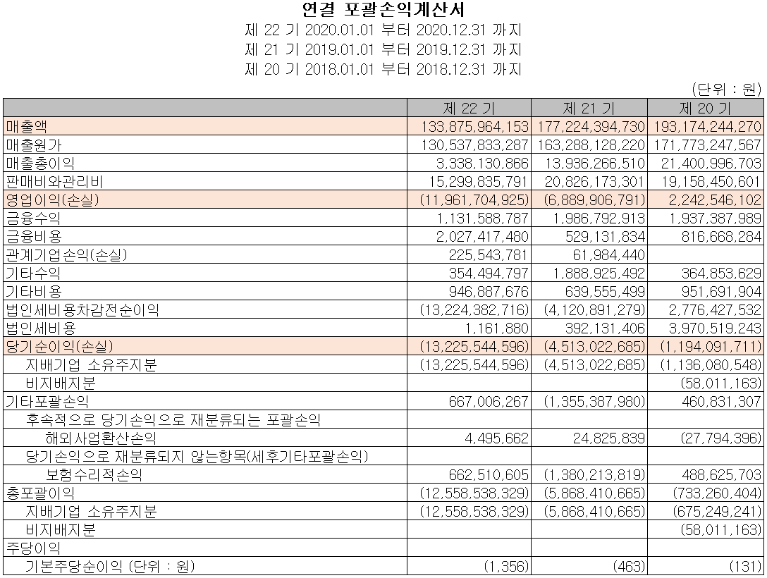 당사의 2020년도 실적에서는 매출액 1,339억 원으로 전년 동기 대비 24.5% 감소했고, 영업손실 120억 원, 당기순손실 132억 원으로 적자 지속입니다. 제조원가 부담, 재고 부담 등 매출원가가 여전히 높은 데다, 코로나19의 영향으로 매출액도 크게 감소하면서 전반적인 실적 악화를 초래했습니다.