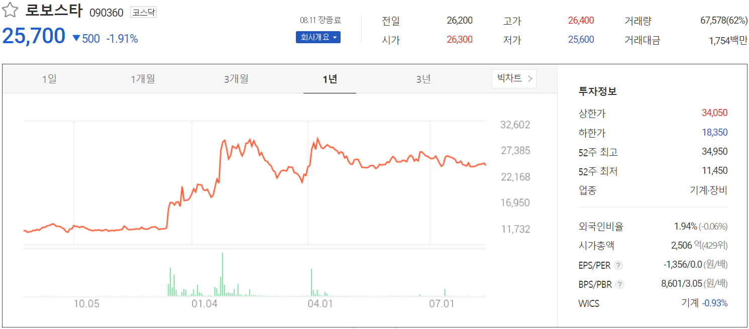 8월 11일 장 종료 기준 당사의 주가는 전 거래일보다 1.91% 내린 25,700원에 거래를 마쳤습니다. 외국인 비중은 1.94%이며 시가 총액 2,506억 원으로 코스닥 시총 상위 429위 종목입니다.