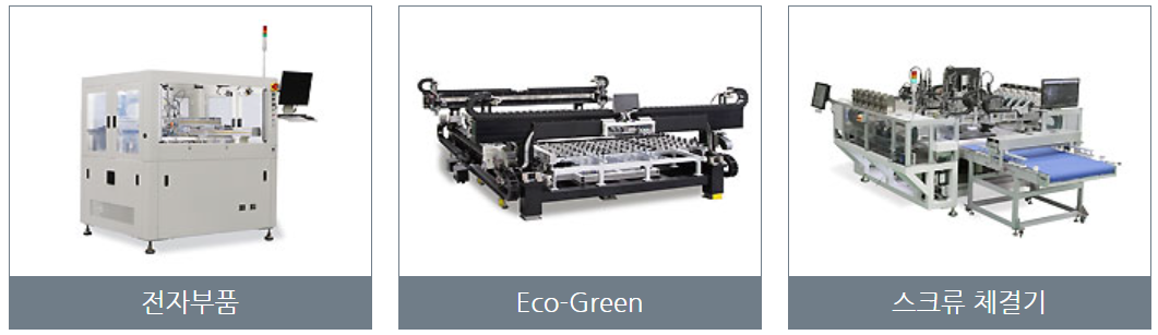 | 공정장비(IT부품 제조) | IT, 전자, 전기 디스플레이, 자동차등 산업 전반에 사용되는 전자부품류를 자동으로 제 조, 검사, 분류, 포장하는 장비 | 핸드폰 및 모바일기기, 전자부품 자동화장비 (2차전지, 가전ㆍ영상 기기 등) | SCREW 체결장비(AVN, 수직다관절, 리니어), MLCC 장비(PSMT, MSMT,T2T), 렌즈조립기 |