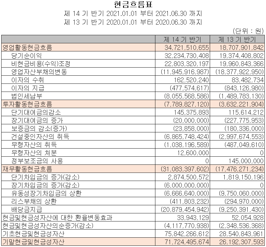 당사의 지난 상반기 영업활동 현금흐름에서는 총 347억 원의 현금이 유입되었으며, 재무활동에서는 장기 차입금의 감소가 있었고, 배당금을 지급하면서 총 310억 원의 현금이 유출되었습니다. 투자활동에서는 PI필름 설비의 증설 등으로 유무형 자산의 증가가 있으며, 총 78억 원의 현금이 유출되었습니다. 2021년 6월 30일 기준 당사의 현금 및 현금성 자산은 전년 동기 대비 455억 원이 증가한 717억 원을 보유하고 있습니다.