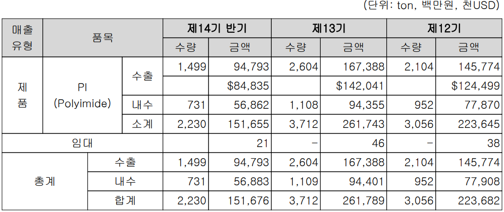 지난 2021년 상반기 당사의 주력사업인 PI 필름의 매출액에서 수출과 내수가 차지하는 비중은 각각 62.5%, 37.5%를 기록했습니다. 기타 투자 부동산에 대한 임대 수익이 있습니다.