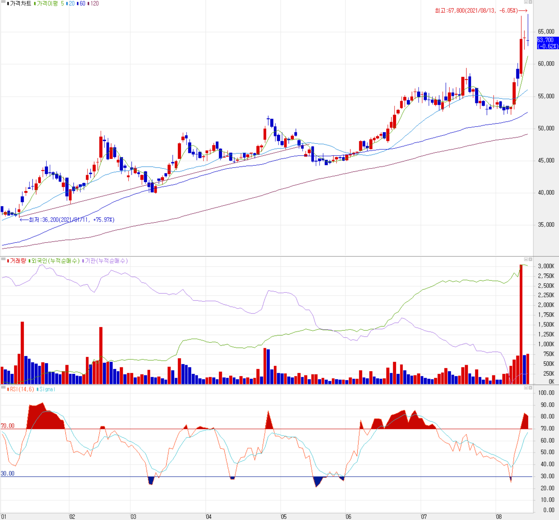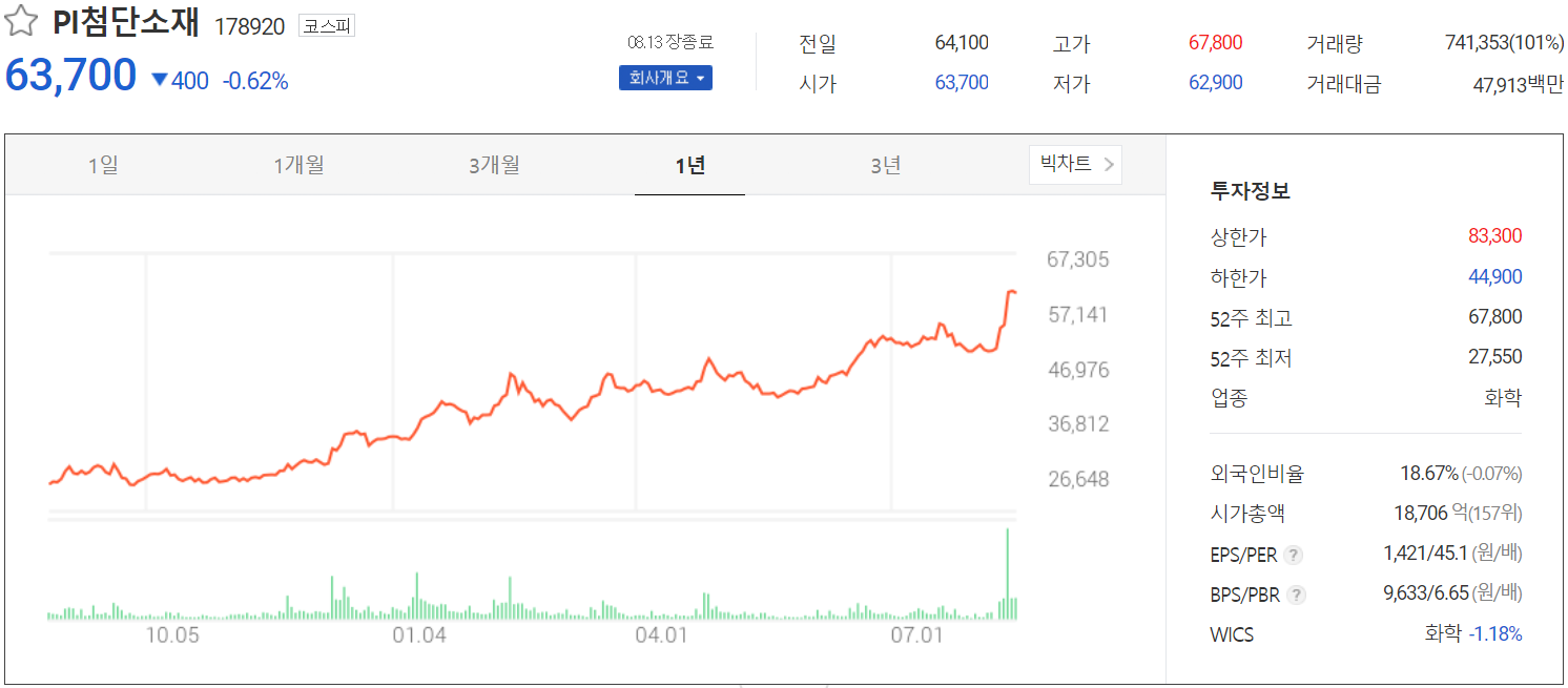 8월 13일 장 종료 기준 당사의 주가는 전 거래일보다 0.62% 내린 63,700원에 거래를 마쳤습니다. 외국인 비중은 18.67%이며 시가 총액 1조 8,706억 원으로 코스피 시총 상위 157위 종목입니다.