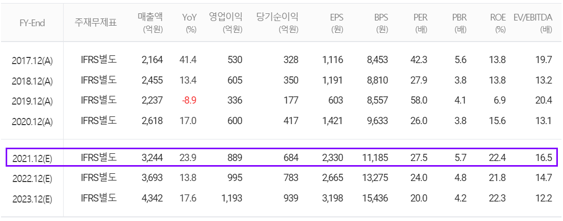 당사의 2021년도 예상 실적은 매출액 3,244억 원으로 전년 대비 23.9% 증가하고, 영업이익은 889억 원으로 48.2% 증가할 것으로 추정했습니다. 방열시트용 PI필름의 장기 공급 계약 및 프리미엄 스마트폰과 배터리 절연용 필름의 공급 확대로 사상 최대 실적을 전망하고 있습니다.