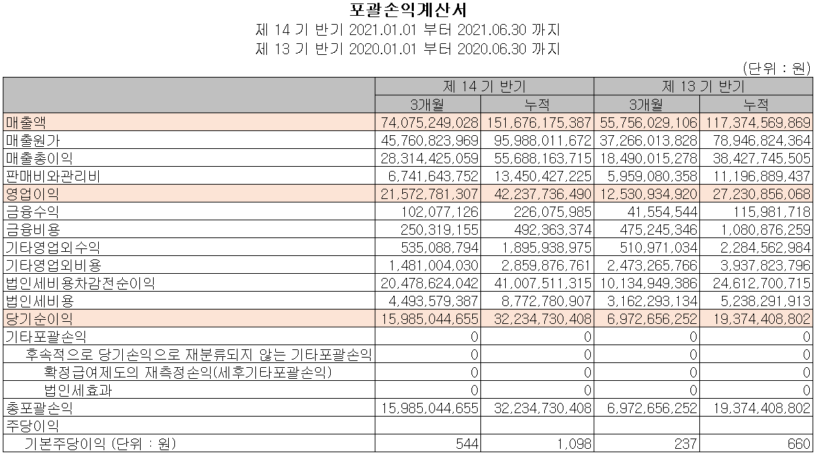당사의 지난 2분기 실적에서는 매출액 741억 원으로 전년 동기 대비 32.9% 증가했고, 영업이익은 216억 원으로 72.2% 증가, 당기순이익은 160억 원으로 129.3% 증가했습니다. 당사에 의하면 비수기임에도 가격 인상과, 사내 원가 절감 노력 그리고 높은 가동률에 따라 영업이익률은 사상 최대치를 기록하였습니다.