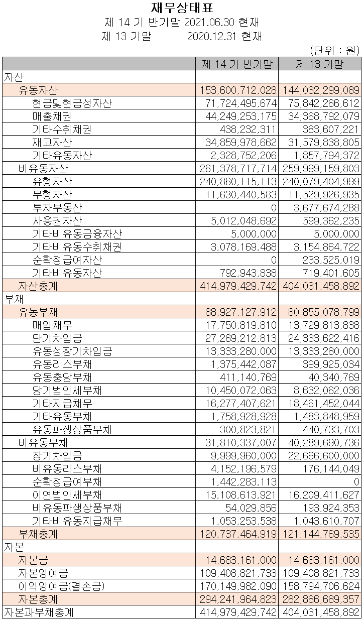 2021년 상반기 말 기준 자산 총계는 전기 말보다 2.7% 증가한 4,150억 원으로 매출 채권 및 사용권 자산의 증가에 기인합니다. 부채는 0.3% 감소한 1,207억 원을 기록했습니다.