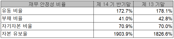 당사의 지난 2021년 상반기 재무 안정성 비율에서는 유동비율 172.7%, 부채비율 41%, 자기 자본 비율 70.9%, 자본 유보율 1,903.9%를 기록하면서 전반적으로 건실하고 안정적인 재무구조를 유지하고 있습니다.