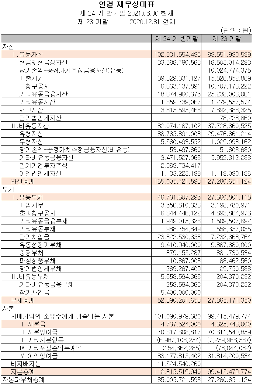 2021년 상반기 말 기준 자산 총계는 전기 대비 29.6%(377억 원) 증가한 1,650억 원으로 현금성 자산, 매출채권 및 유무형 자산의 증가에 기인합니다. 부채는 88%(245억 원) 증가한 524억 원으로 장단기 차입금의 증가가 있었습니다.