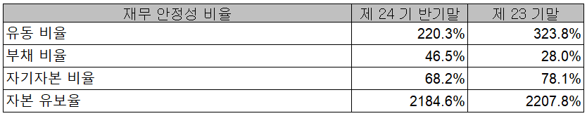 2021년 상반기 말 기준 재무안정성 비율에서는 유동비율 220.3%, 부채비율 46.5%, 자기자본 비율 68.2%, 자본 유보율 2,184.6%를 기록하면서 양호한 재무상태를 유지하고 있습니다.