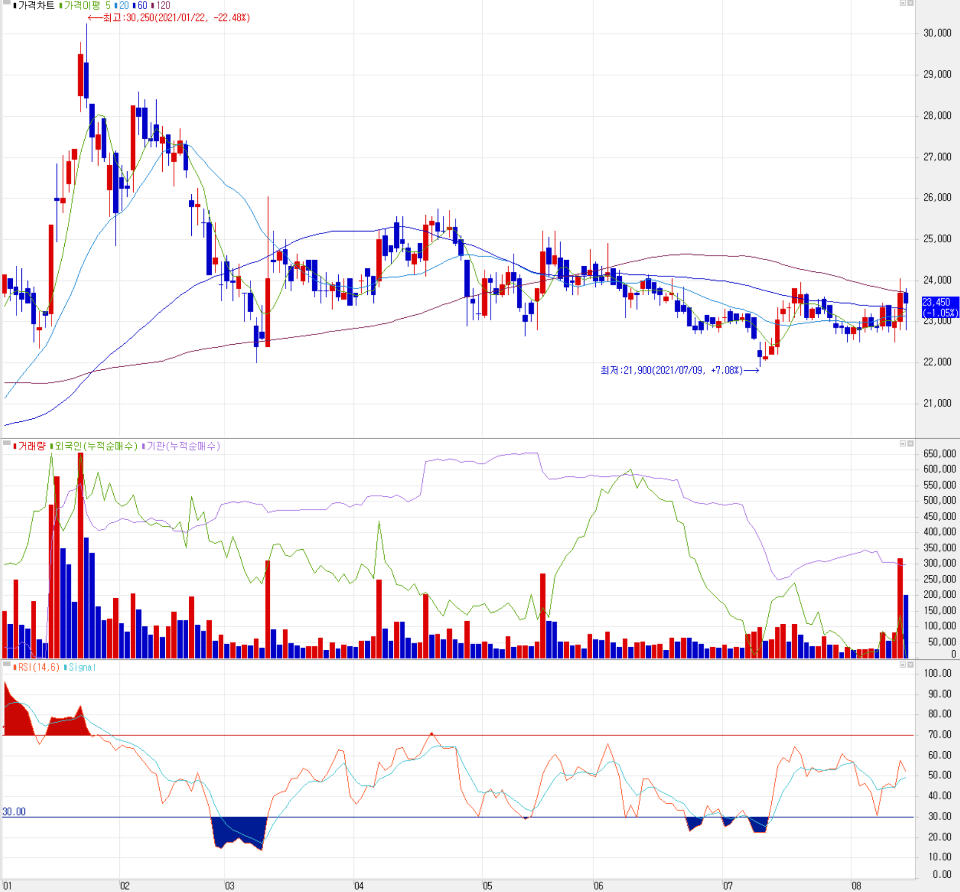 당사의 주가는 올해 들어서면서 1월 중 당사의 공정 자동화 장비의 수요 증가 전망에 따라 최고가인 30,250원을 기록한 이후 시장 변동성 등에 따른 조정을 받으면서 대부분 되돌렸고, 이후 3월 후반부터 최근까지 23,000원 부근에서 주가가 형성되고 있습니다. 지난 7월 기관의 순매수가 강했다가 8월 들어서는 주체별 손바뀜이 활발하면서 2차전지 관련 종목으로 재조명을 받고 있는 모습이지만, 아직 상승세로 돌았다고 판단하기는 이른 것 같습니다. 장중 하락 시 일부 매수 전략을 고려중에 있으며, 예상 실적 및 차트 소견을 종합한 개인적인 목표 주가는 28,000원으로 설정합니다.