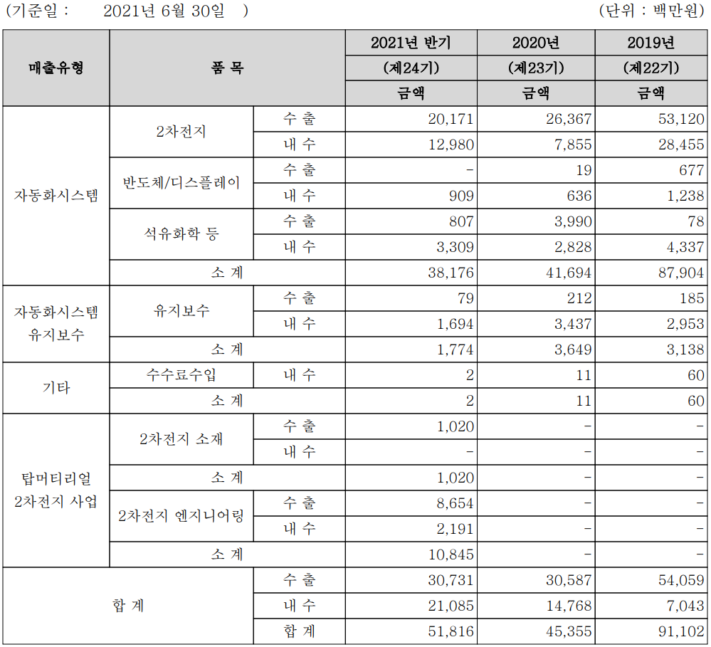 당사는 2차전지, 반도체 및 디스플레이 그리고 석유화학 산업의 제조 공정 자동화 시스템을 주력으로 합니다. 지난 1분기 탑머티리얼 최대 주주가 되면서 실적도 편입되었습니다. 지난 2021년 상반기 실적에서 주력 사업인 자동화 시스템 중 2차 전지의 매출은 332억 원으로 전체 매출의 63.98%를 차지하였으며, 반도체 및 디스플레이는 9억 원으로 1.75%, 석유화학 분야는 41억 원으로 7.94%의 매출 비중을 나타냈습니다. 올해 신규 편입된 탑머티리얼의 2차 전지 소재 부문은 10억 원으로 1.97%, 엔지니어링 부문은 108억 원으로 20.93%의 매출 비중을 기록했습니다.