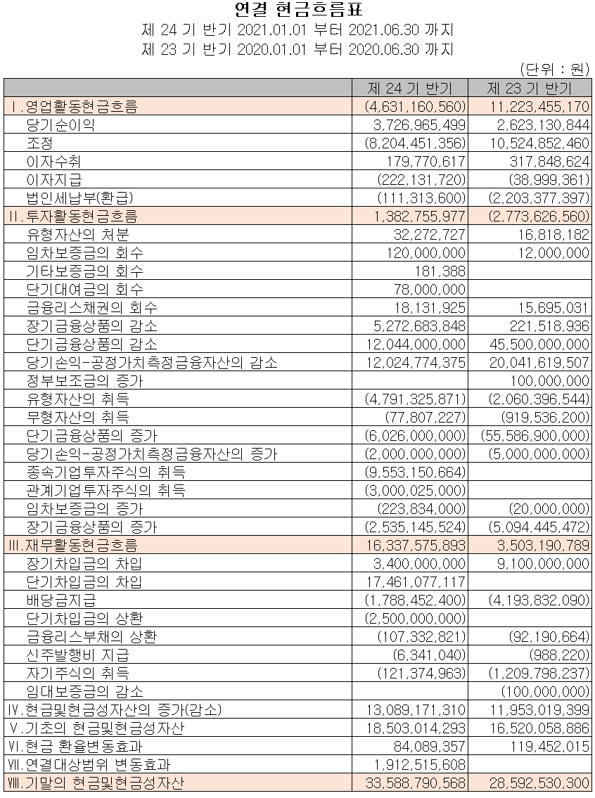 당사의 2021년 상반기 영업활동 현금흐름에서는 이익은 증가하였으나 운전자산의 변동에 따라 총 46억 원의 현금이 유출되었습니다. 장단기 차입금을 조달하여 부채를 상환하고, 배당금을 지급하였으며 자기 주식의 취득이 있었습니다. 투자활동에서는유무형 자산의 취득이 있었으나 금융상품 및 공정가치 금융자산 등으로 인해 총 14억 원의 현금이 유입되었습니다. 2021년 6월 30일 기준 현금 및 현금성 자산은 전년 동기 대비 50억 원이 증가한 336억 원을 기록하였습니다.