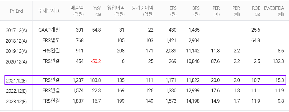 당사의 2021년 예상 실적은 매출액 1,287억 원으로 전년 대비 183.8% 증가하고, 영업이익은 135억 원으로 2,150% 증가할 것으로 추정했습니다.