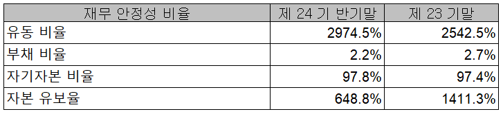 2021년 상반기 말 기준 재무 안정성 비율에서는 유동비율 2,974.5%, 부채비율 2.2%, 자기 자본비율 97.8%, 자본 유보율 648.8%를 기록하면서 전반적으로 양호한 재무상태를 유지하고 있습니다. 2차 전지 부품의 설계 변경으로 수요가 급감하면서 실적 부진으로 어려움을 겪고 있으나, 현재 설비투자를 완료하고 시운전 중으로 고객사와 제품 양산 및 공급에 대한 협의 중으로 후반기 실적 개선을 기대할 수 있겠습니다.