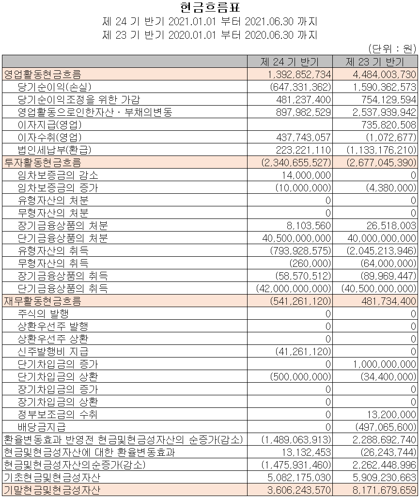 지난 상반기 영업활동 현금흐름에서는 당기순손실에도 운전자산의 변동에 따라 총 14억 원의 현금이 유입되었습니다. 재무활동에서는 부채를 상환하였으며, 투자활동에서는 유무형 자산의 취득이 있었습니다. 상반기 말 기준 자금 조달을 위해 금융상품의 처분으로 인한 현금 및 현금성 자산은 전기보다 46억 원이 감소한 36억 원을 보유하고 있습니다. 적자 지속으로 현금 자산의 보유가 나빠지고 있으나, 조만간 신제품 개발 및 설비 투자로 인한 실적 개선을 예상하고 있습니다.