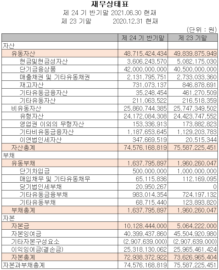 2021년 상반기 말 기준 자산 총계는 전기보다 1.3% 줄어든 746억 원을 기록했으며, 부채는 16.5% 줄어든 16억 원을 기록했습니다.