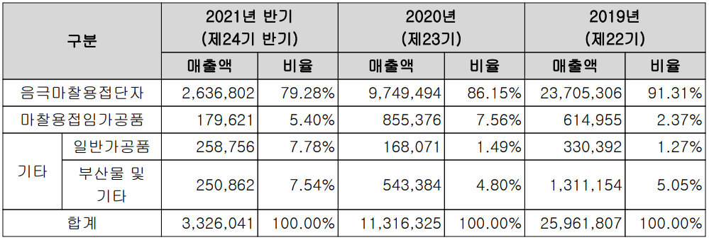 2021년 상반기 음극마찰용접단자의 매출은 26억 원으로 전체 매출의 79.28%를 차지하였고, 마찰용접임가공품은 1.8억 원으로 5.4%를 기록하였습니다. 전체 매출에서 수출과 내수가 차지하는 비중은 각각 77.2%, 22.8%를 나타내고 있습니다.
