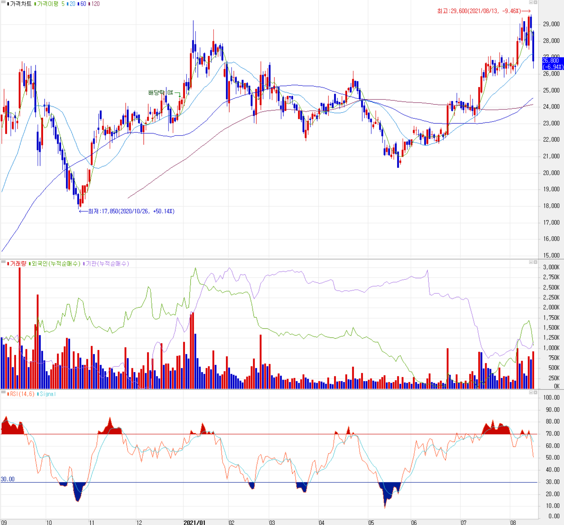 전반적인 수급에서는 여전히 외국인과 기관이 매수 우위를 보이고 있으나 2일 연속 개인이 순매수하면서 수급 주체간 변동이 예상됩니다. 추가 조정시 26,000원 선을 지키고 반등할지 지켜볼 예정이며, 차트 소견 및 예상 실적에 기반한 개인적인 목표주가는 30,500원으로 설정하였습니다.