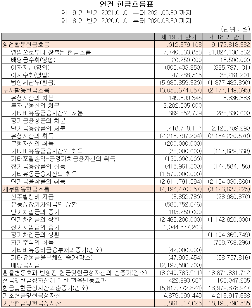 당사의 지난 상반기 영업활동 현금흐름에서는 총 10억 원의 현금이 유입되었으며, 투자활동에서는 유무형 자산의 취득 등으로 31억 원의 현금이 유출되었습니다. 재무활동에서는 차입금을 조달하여 부채를 상환하고 배당금을 지급하면서 총 42억 원의 현금이 유출되었습니다. 2021년 6월 30일 기준 당사의 현금 및 현금성 자산은 전년 동기 대비 93억 원 감소한 89억 원을 보유하고 있습니다.