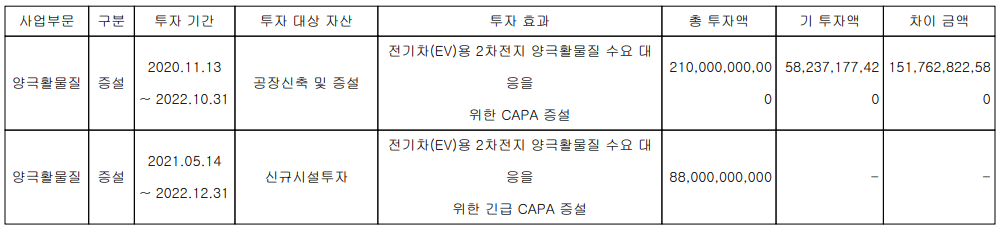 2차전지 양극활물질 생산을 위한 신규 시설 투자