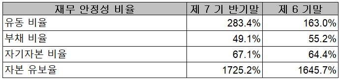 2021년 상반기 말 기준 재무 안정성 비율에서는 유동비율 283.4%, 부채비율 49.1%, 자기자본비율 67.1%, 자본유보율 1,725.2%를 기록하면서 양호한 재무상태를 유지하고 있습니다.