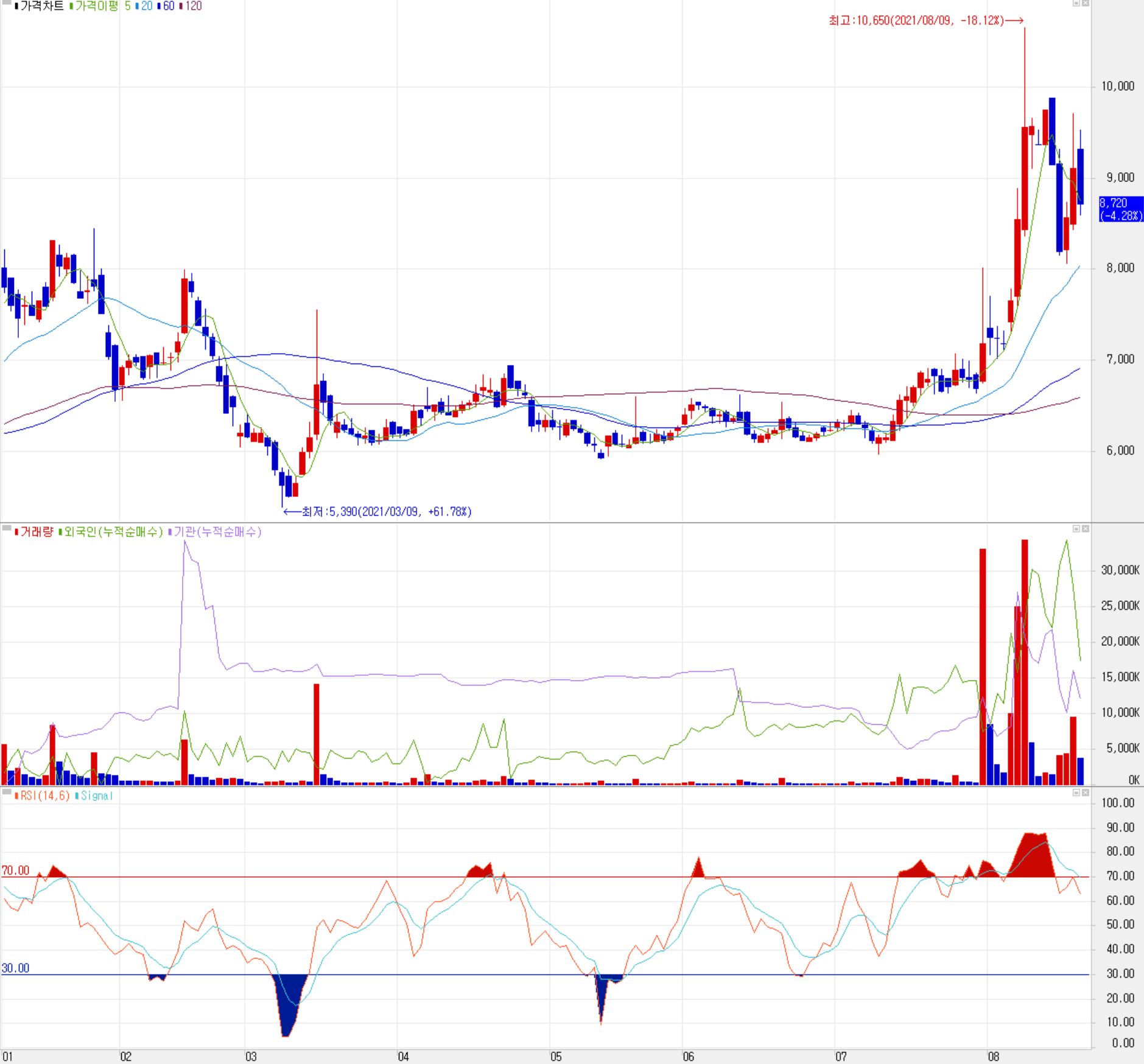 당사의 주가는 지난 7월부터 2차전지 전방산업의 투자 확대에 따라 관련 업종에 수급이 몰리고, 8월 들어서는 정부의 탄소중립 시나리오 방안에 따른 수혜주로 꼽히면서 가파른 상승을 보였고, 고객사인 삼성SDI가 반도체 핵심 소재인 '포토레지스트'의 독자 개발에 착수했다는 소식이 전해지면서 그 포토레지스트의 핵심소재인 광개시재가 당사의 주요 생산품인 부문이 부각되면서 추가 상승을 이끌었습니다. 지난 한 달간 수급에서는 기관과 외국인의 매수 우위였으나, 최근 미국 연준의 양적완화 축소 및 환율 등의 영향으로 변동성이 커지는 상황입니다. 이미 지난 분석글에서 개인적인 목표주가인 7,400원을 넘어섰고, 급등에 따른 조정 및 시장 변동성으로 인해 다음 주는 관망하면서 8,000원 선을 지지하는지 확인 후 접근 방안을 정리할 예정입니다. 당분간 투자는 소극적 자세가 맞는 것 같으며, 미국 테이퍼링, 중국 유동성 축소, 델타 변이 바이러스 등에 대한 소식에 따른 변동성을 보일 것으로 생각됩니다.