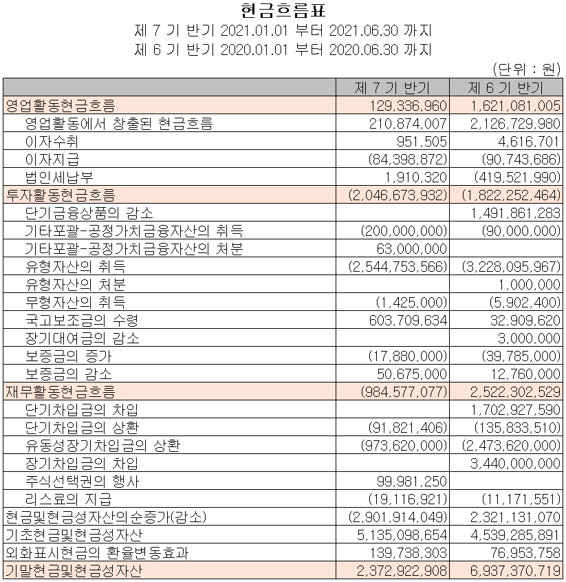 당사의 지난 상반기 영업활동 현금흐름은 1.3억 원의 현금이 유입되었으며, 투자활동에서는 유형자산(기계 장치 등 설비)의 취득이 있었습니다. 재무 활동에서는 부채를 상환했고, 리스비용을 지급하였습니다. 2021년 6월 30일 기준 현금 및 현금성 자산은 전년 동기보다 46억 원이 감소한 24억 원을 보유하고 있습니다.
