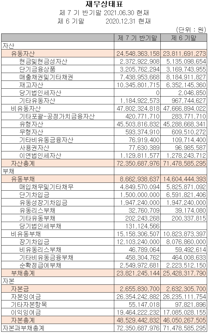 2021년 6월 30일 기준 자산 총계는 전기보다 1.2% 증가한 724억 원이며, 부채는 6.3%(16억 원) 감소한 238억 원으로 매입채무 및 단기차입금의 감소가 있었습니다. 자본총계는 이익의 증가에 따라 25억 원 증가한 485억 원을 기록했습니다.