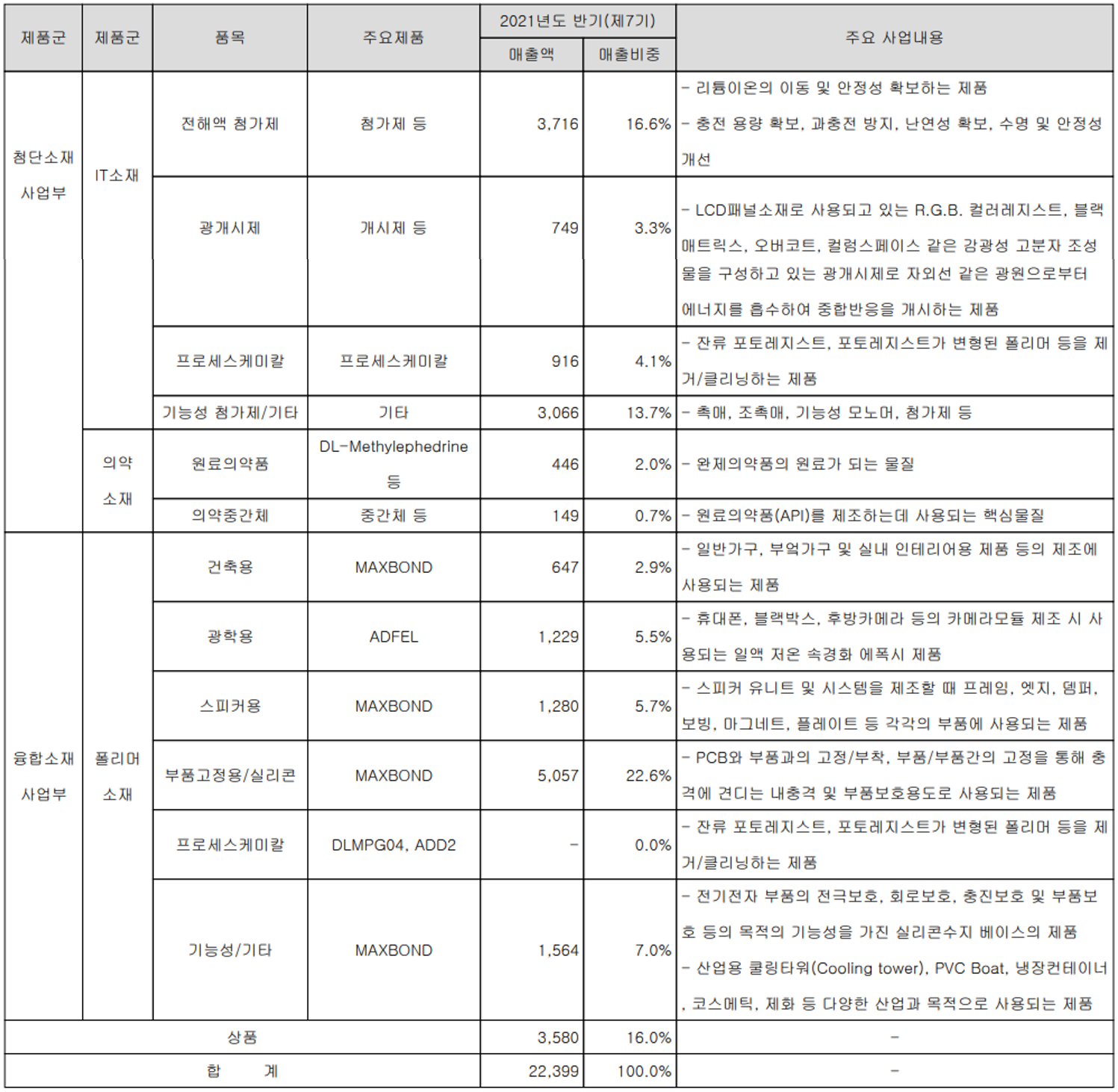 당사의 사업부문은 크게 첨단소재 사업부와 융합소재 사업부로 구성되어 있으며, 첨단소재 사업부에는 2차전지의 전해액 첨가제 및 촉매, 모노머 그리고 디스플레이 소재로 사용되는 광개시제와 프로세스 케미칼 등이 있습니다. 융합소재 사업부에는 건축, 광락, 스피커, 부품 고정용 실리콘 등 다양한 산업에 적용되는 폴리머 소재를 제조, 공급하고 있습니다. 지난 2021년 상반기 2차전지 전해액 첨가제의 매출은 37억 원으로 전체 매출의 16.6%를 차지하였으며, 기타 반도체 및 디스플레이 등에 적용되는 기능성 첨가제의 매출은 31억 원으로 13.7%, 부품 고정용/실리콘의 매출은 51억 원으로 22.6%의 매출 비중을 나타냈습니다.