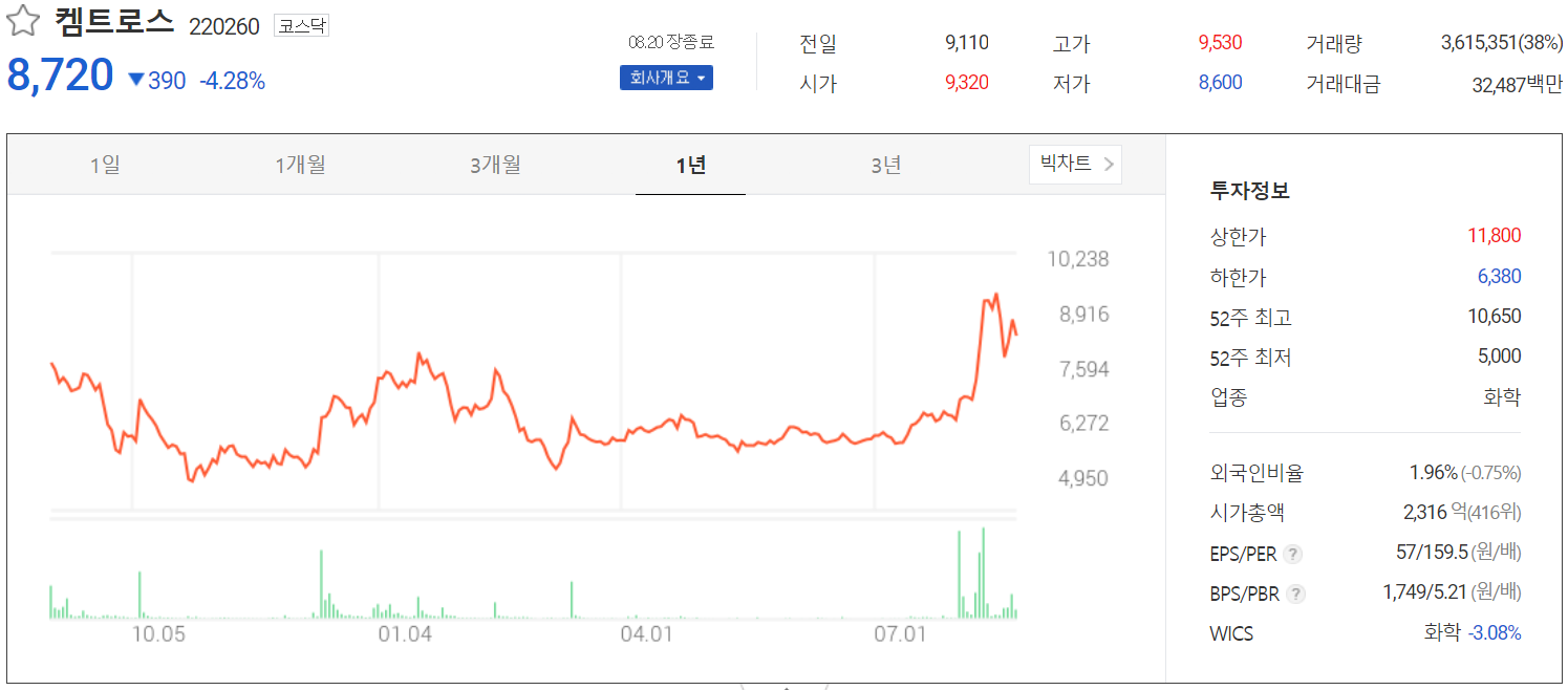 8월 20일 장 종료 기준 당사의 주가는 전 거래일보다 4.28% 내린 8.720원으로 마감했습니다. 외국인 비중은 1.96%이며, 시가 총액 2,316억 원으로 코스닥 시총 기준 416위 종목입니다.