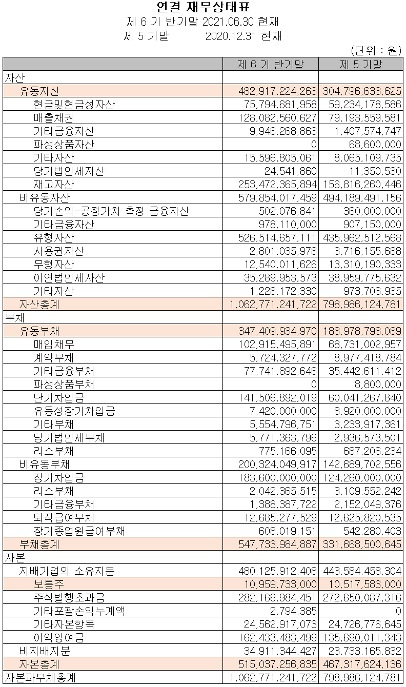 2021년 상반기 말 기준 당사의 자산 총계는 전기보다 33%(2,638억 원) 증가한 1조 628억 원으로 현금 및 현금성 자산, 매출 채권, 재고 자산 및 유형 자산의 증가에 기인합니다. 부채총계는 65.1%(2,161억 원) 증가한 5,477억 원으로 매입채무, 기타금융부채, 차입금 등의 증가가 있었습니다. 이익의 증가에 따라 자본총계는10.2% 증가한 5,150억 원을 기록했습니다.
