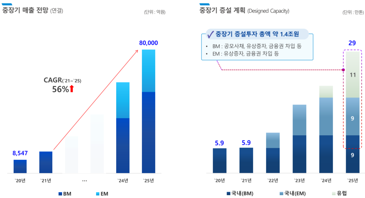 당사는 지난 2분기 IR을 통해 2025년까지 29만 톤의 양극재 생산 능력을 확보하여 연평균 56%의 성장을 통해 매출 8조 원을 달성한다는 중장기 목표를 세웠습니다.