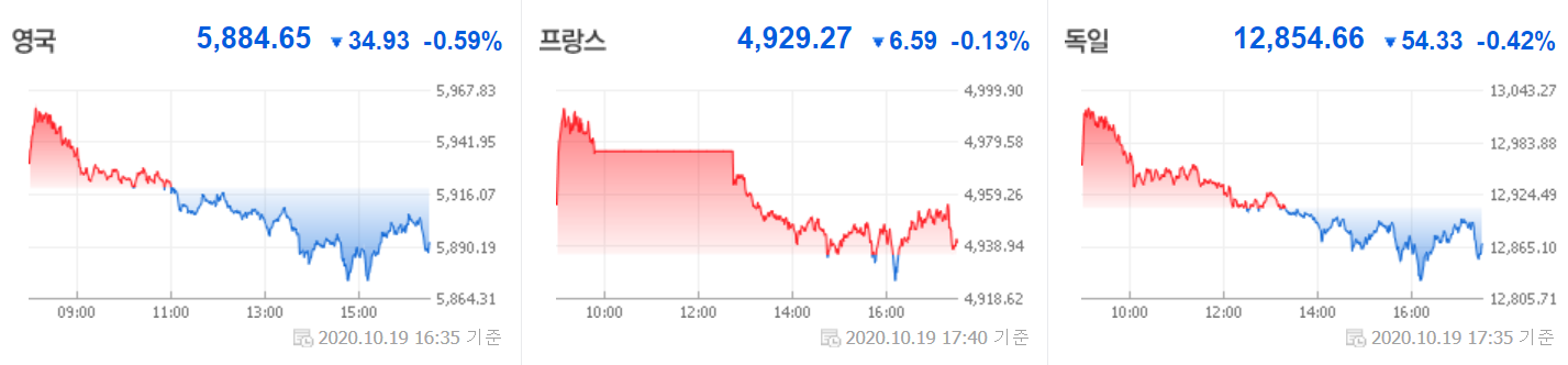 그렇지 않아도 코로나19 2차 확산으로 불안한 장세에 유럽이 어제는 프랑스 파리 증권거래소가 기술적 결함으로 3시간가량 거래 중단을 하는 사태가 벌어졌습니다. 상승 출발했던 영국, 프랑스, 독일의 증시는 오후 들어 하락세로 돌아서며 장을 마감했습니다. 이는 중국의 경제지표에 반응하던 기존의 유럽증시 상황과는 달리, 미국발 정치적 이슈와 영국의 브렉시트 협상이 난항인 문제에 대한 문제로 풀이됩니다.