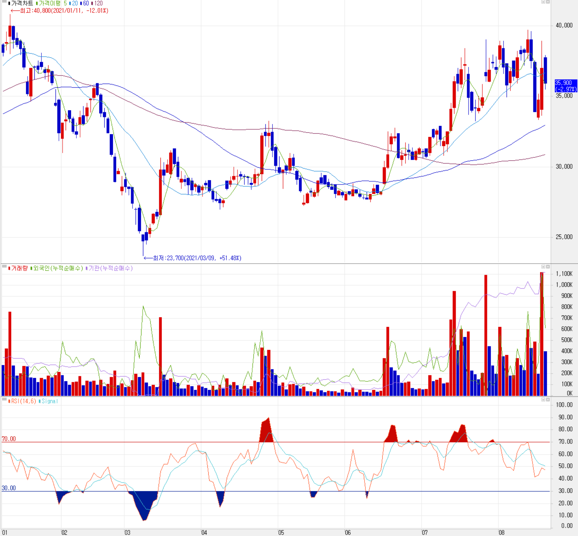 지난해 부진한 실적이 발표되면서 하락했던 주가는 3월 9일 저점인 23,700원을 기점으로 최근까지 꾸준히 우상향하고 있는 모습입니다. 최근 며칠 동안은 미국 테이퍼링 이슈 등 시장 외적인 상황으로 주가 변동성을 보였습니다. 전반적으로는 외국인과 기관이 비교적 매수 우위를 보이고 있으며, 거래량이 증가 추세에 있습니다. 특히 2022년부터는 음극재용 도전재 외에도 양극재용 도전재와 실리콘 음극활물질이 공급될 것으로 전망되면서 주가의 상승을 이끌었습니다. 당사의 사업 전망 및 차트 소견을 종합한 개인적인 목표주가는 40,000원으로 설정하였고, 추가 조정 시 33,000원 선을 지지하는지 점검한 후 진입을 결정할 예정입니다. 최근 미국 테이퍼링 이슈, 중국 양적완화 축소 등 글로벌 경제 정책 기조에 따른 주가 변동성이 크기 때문에 신규 진입은 소극적인 자세를 취하는 게 좋겠습니다.
