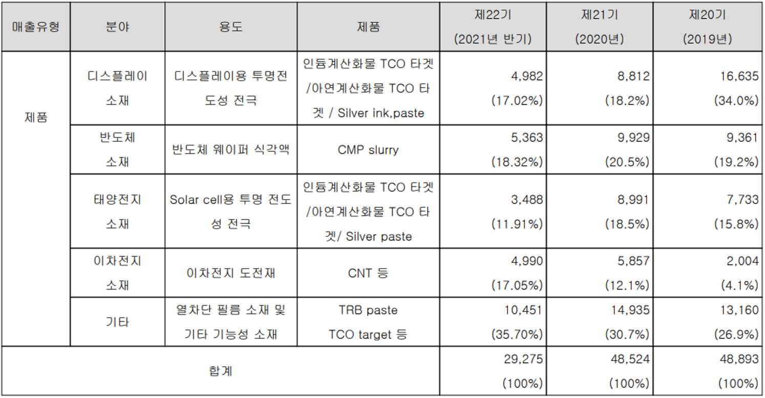 당사의 나노 기반의 첨단 산업용 소재에는 디스플레이, 반도체, 태양전지 및 2차전지 부문 등의 핵심 소재 부문으로 구성되어 있습니다. 지난 상반기 디스플레이 소재 부문 매출은 50억 원으로 전체 매출의 17.02%를 기록하였으며, 반도체는 54억 원으로 18.32%, 태양전지 부문은 35억 원으로 11.91%, 2차전지 소재 부문은 50억 원으로 17.05%의 매출 비중을 나타냈습니다.