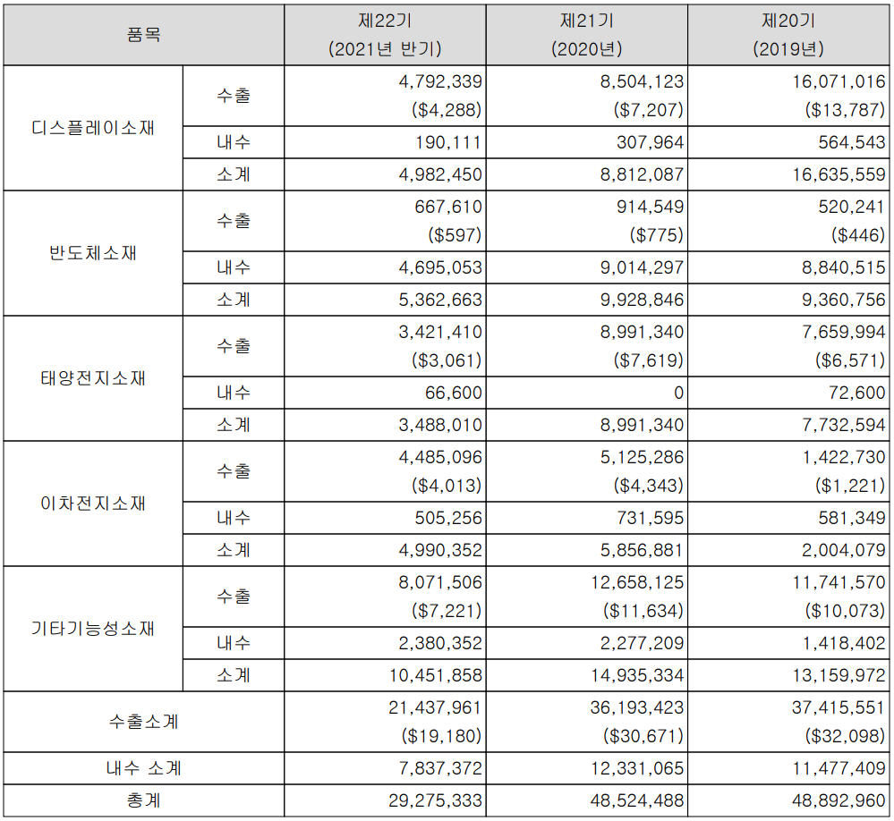 2021년 상반기 실적에서 디스플레이 소재 부문의 수출과 내수의 비중은 각각 96.2%, 3.8%를 차지하였으며, 반도체는 12.4%, 87.6% 그리고 2차전지는 수출 89.9%, 내수 10.1%의 매출 비중을 기록하였습니다. 당사 전체 매출에서 수출은 73.2%, 내수는 26.8%를 나타냈습니다.