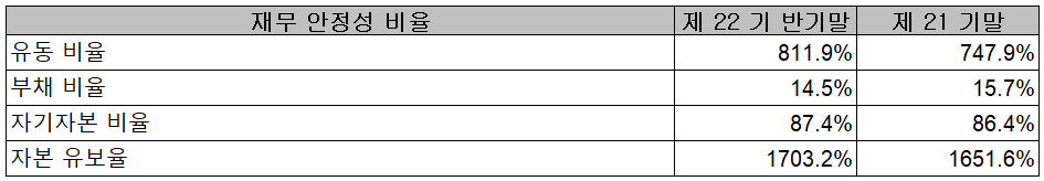2021년 상반기 말 기준 재무 안정성 비율에서는 유동비율 811.9%, 부채비율 14.5%, 자기자본비율 87.4%, 자본유보율 1,703.2%를 기록하면서 전반적으로 건실하고 안정적인 재무상태를 유지하고 있습니다.
