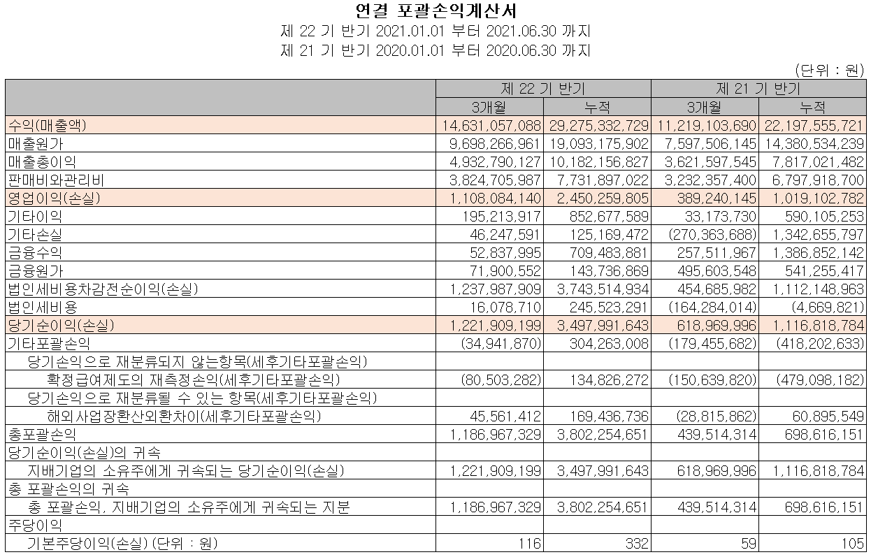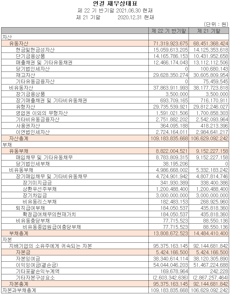 2021년 6월 30일 기준 자산 총계는 2.4% 증가한 1,092억 원이며, 부채는 4.7% 줄어들면서 138억 원을 기록했습니다. 이익의 증가에 따라 자본총계는 3.5% 증가하면서 954억 원을 기록했습니다.