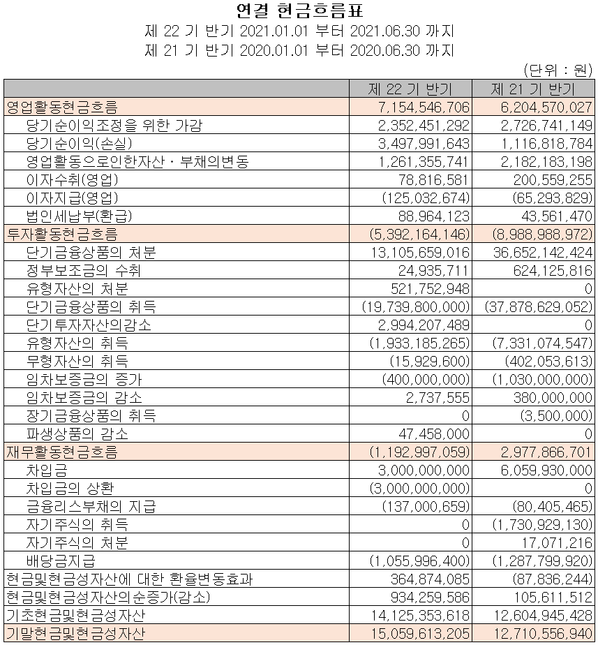 2021년 상반기 영업활동 현금흐름에서는 72억 원의 현금이 유입되었으며, 투자활동에서는 단기금융상품 및 유무형 자산의 취득으로 54억 원의 현금이 유출되었습니다. 재무활동에서는 차입금을 조달하여 부채를 상환했고, 배당금을 지급하면서 총 12억 원의 현금이 유출되었습니다. 2021년 6월 30일 기준 현금 및 현금성 자산은 전년 동기 대비 23억 원이 증가한 151억 원을 보유하고 있습니다.