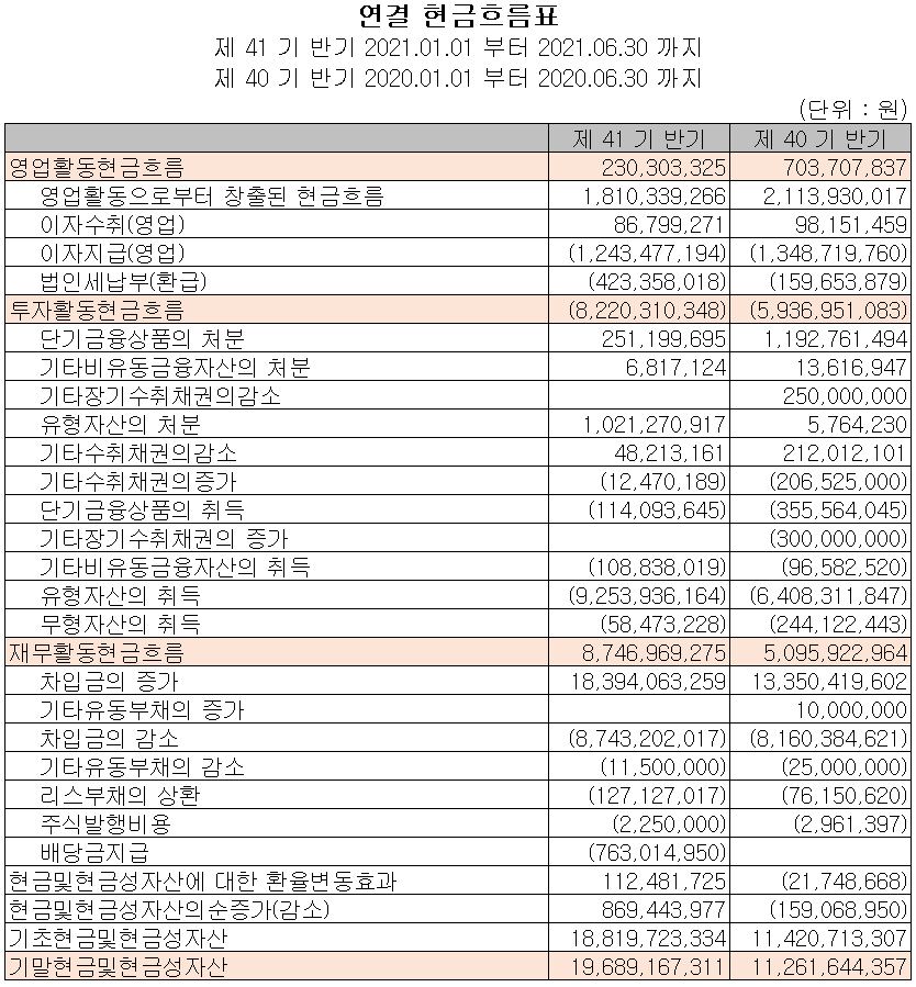 당사의 지난 상반기 영업활동 현금흐름에서는 총 2.3억 원의 현금이 유입되었습니다. 투자활동에서는 설비 투자로 인한 유무형 자산의 취득으로 총 82억 원의 현금이 유출되었으며, 재무활동에서는 차입금을 조달하여 부채를 상환하고, 배당금을 지급하였습니다. 2021년 6월 30일 기준 현금 및 현금성 자산은 전년 동기 대비 84억 원이 증가한 197억 원을 보유하고 있습니다.