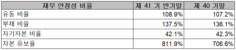 2021년 상반기 말 기준 재무 안정성 비율에서는 유동비율 108.9%, 부채비율 137.5%, 자기자본비율 42.1%, 자본유보율 811.9%를 기록했습니다. 최근 수년간 신재생에너지 관련 소재의 개발 등에 따른 비용 부담으로 부채비율이 높은 편이지만, 실리콘 음극재의 수요 급증 등에 따른 실적 개선과 비례하여 재무상태도 개선될 것으로 판단합니다.