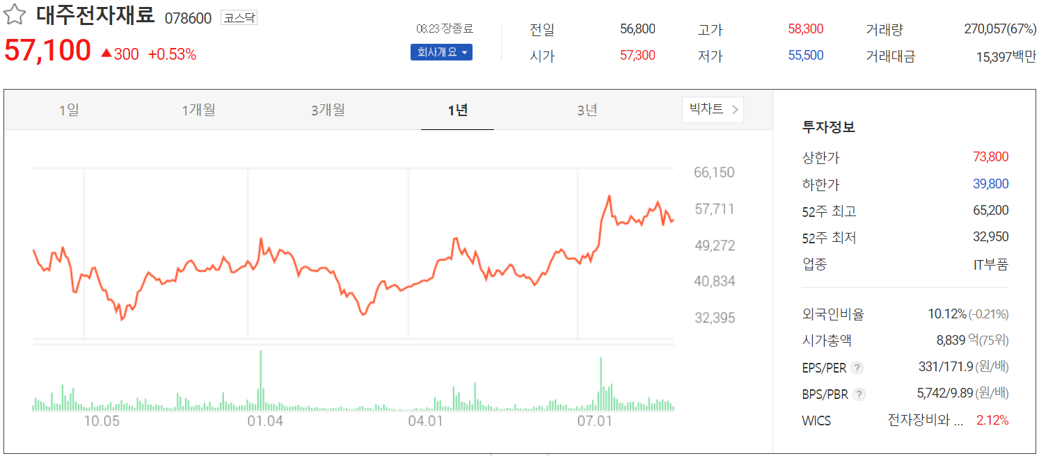 8월 23일 장 종료 기준 당사의 주가는 전 거래일보다 0.53% 오른 57,100원에 거래를 마감했습니다. 외국인 비중은 10.12%이며, 시가 총액 8,839억 원으로 코스닥 시총 기준 75위 종목입니다.