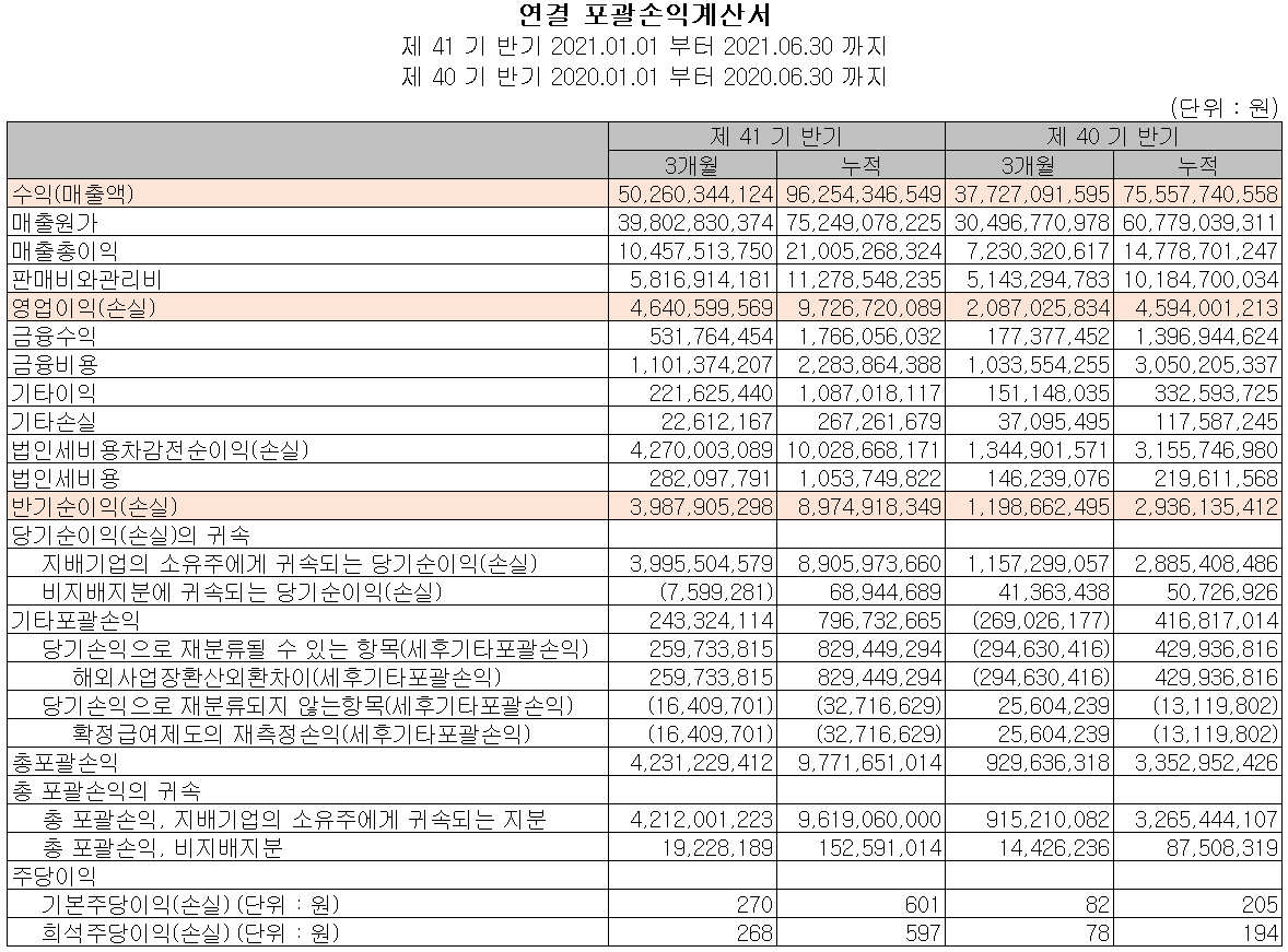 당사의 지난 2분기 실적에서는 매출액 502억 원으로 전년 동기 대비 33.2% 증가했고, 영업이익은 46억 원으로 22.4% 증가, 당기순이익은 40억 원을 기록하면서 232.7% 증가했습니다. 고른 제품군에서 매출 증가가 있었으나, 코로나19에 따른 기저효과도 추정되지만 특히 태양전지 전극재료와 2차전지 음극재 부문에서의 수요 급증으로 전반적인 실적을 견인하였습니다.